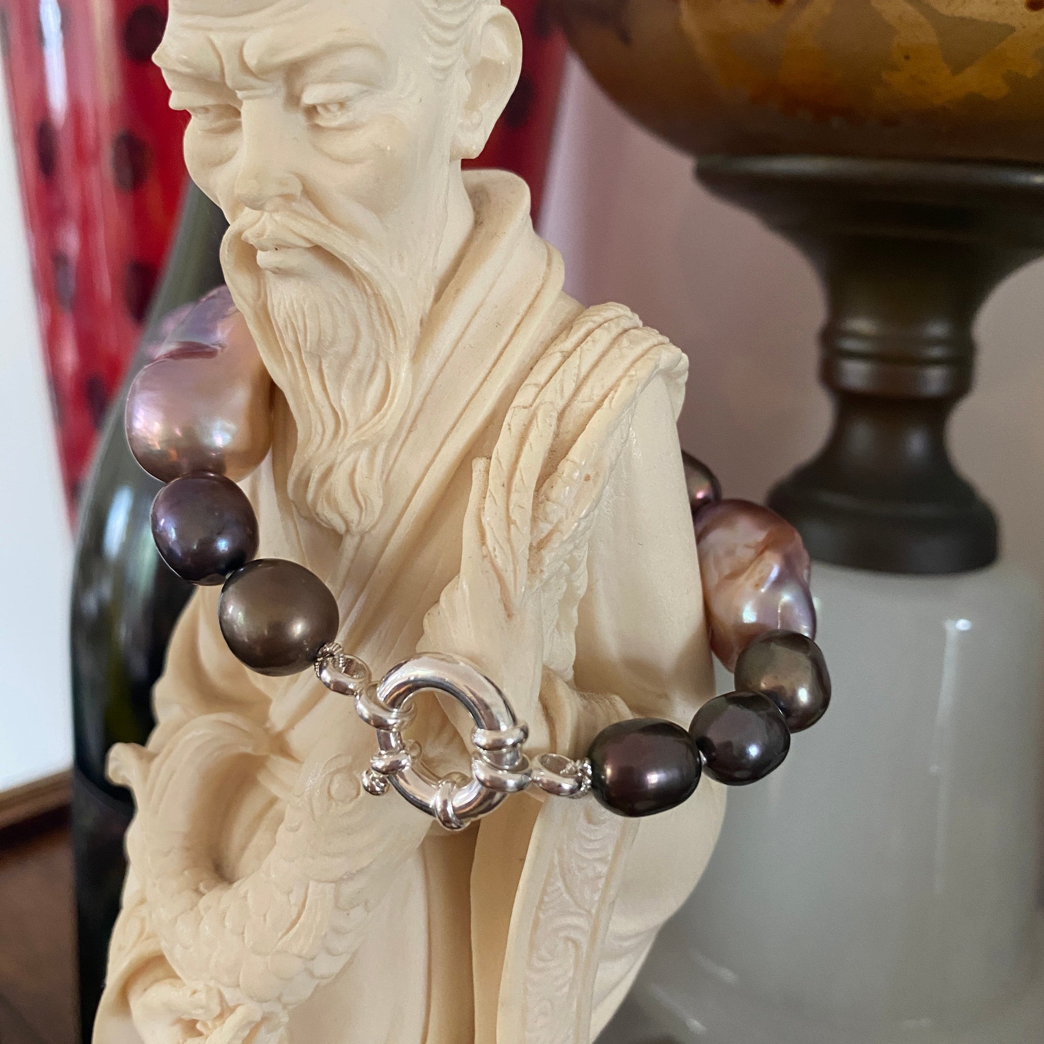 Freshwater pearl strand bracelet featuring three large deep lavender baroque pearls and Eight chocolate Drop shape pearls 9-10mm creating a stunning Chocolate Delight feeling with these warm colors mixed together