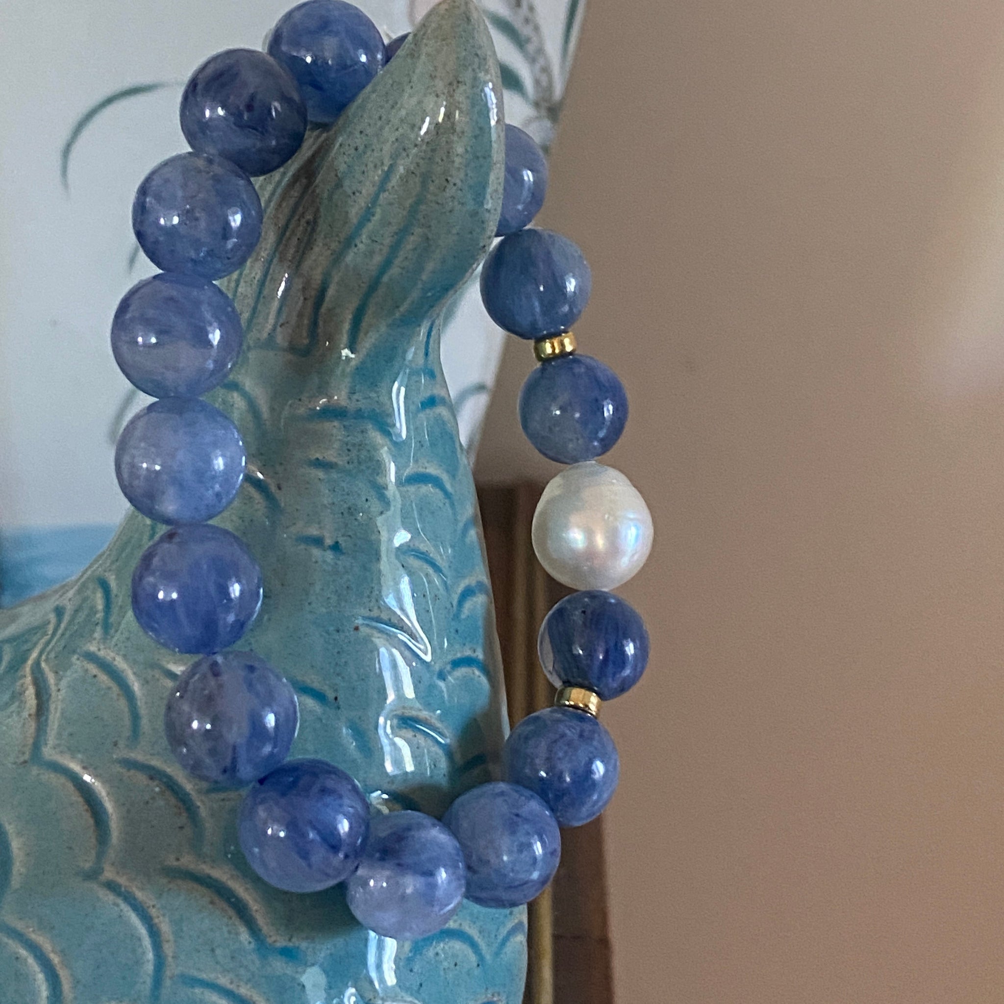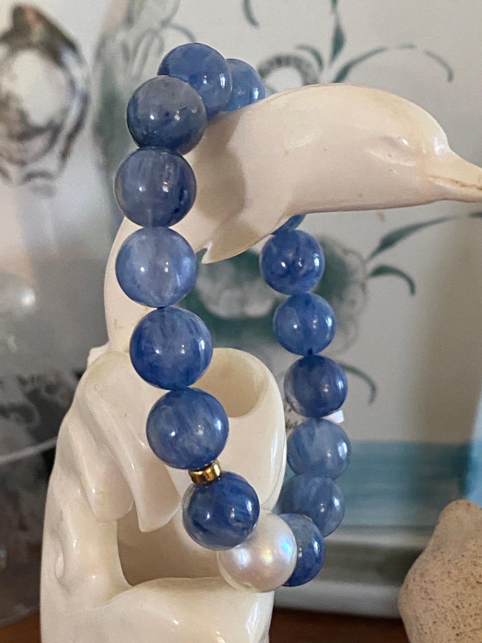 Stunning polished Round Aquamarine beads in an elastic bracelet featuring a white Australian South Sea Pearl