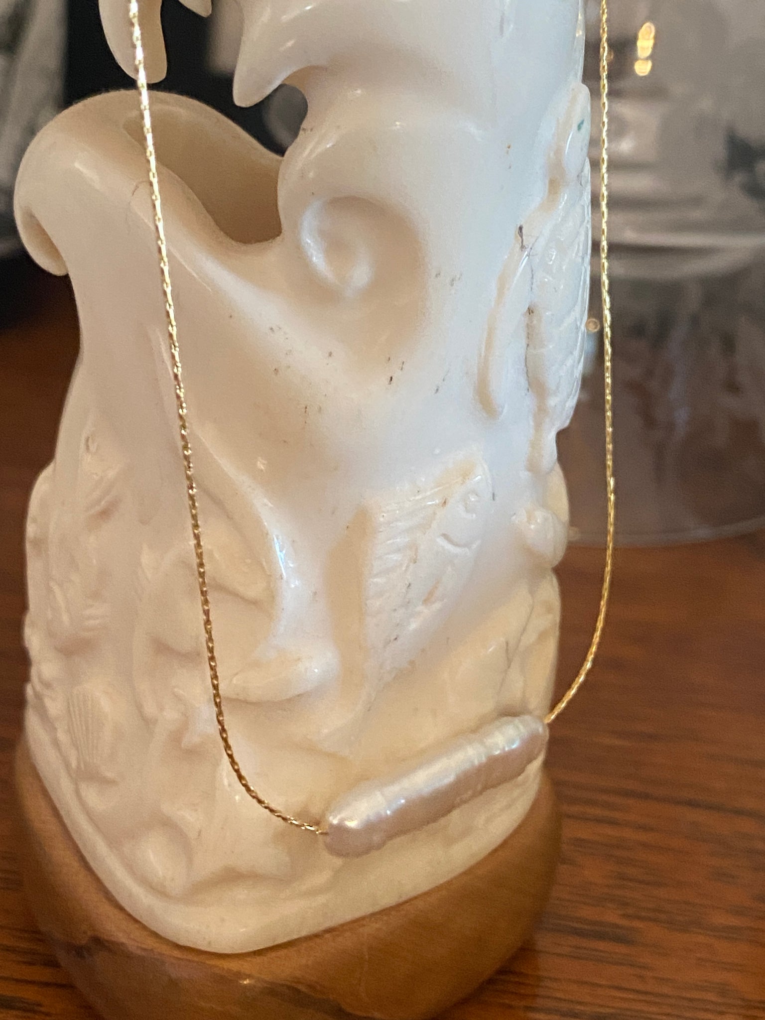 This necklace features a white Freshwater BIWA Pearl on a Gold plated Sterling Silver Chain with a sterling silver lobster clasp with extension chain