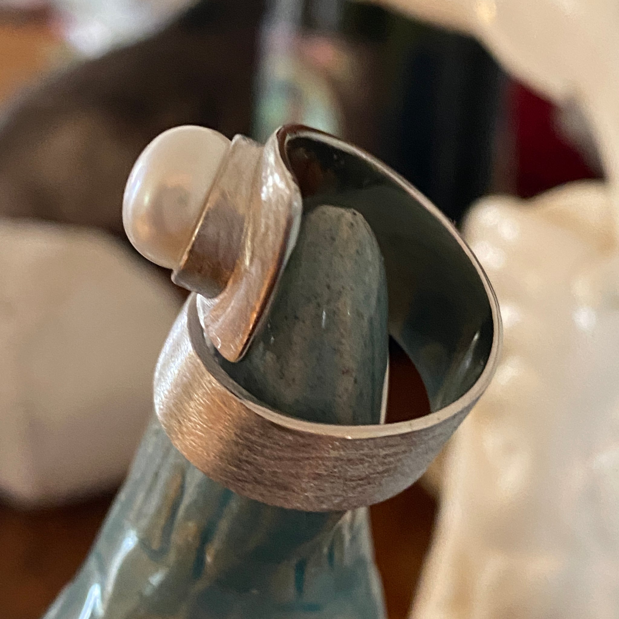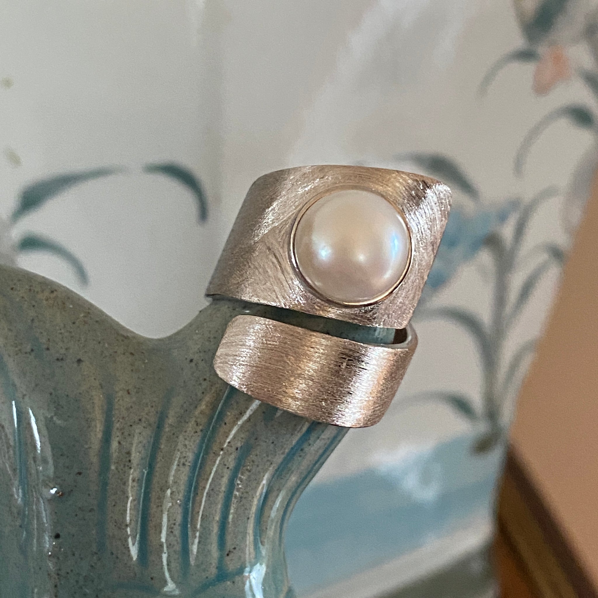 Textured 925 Sterling silver Twist ring featuring a Button shape White 10mm Freshwater Pearl