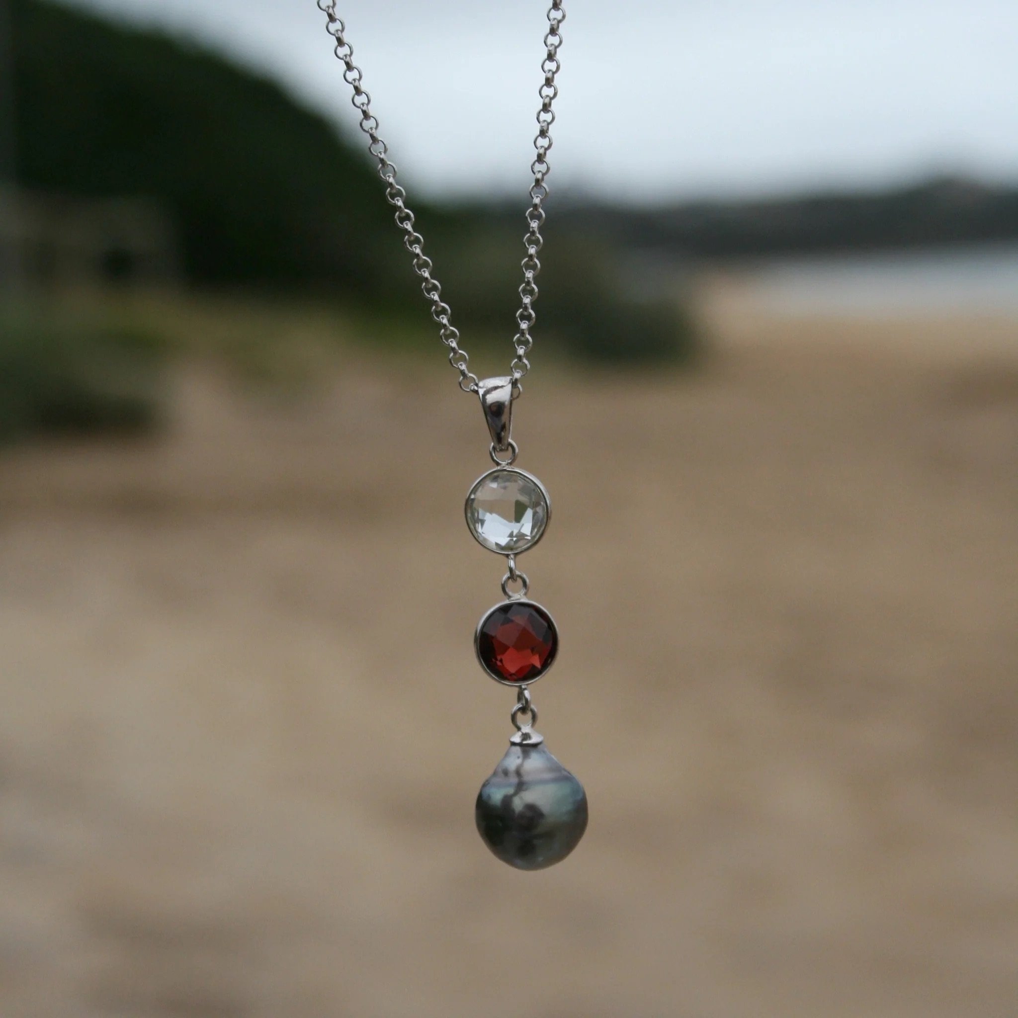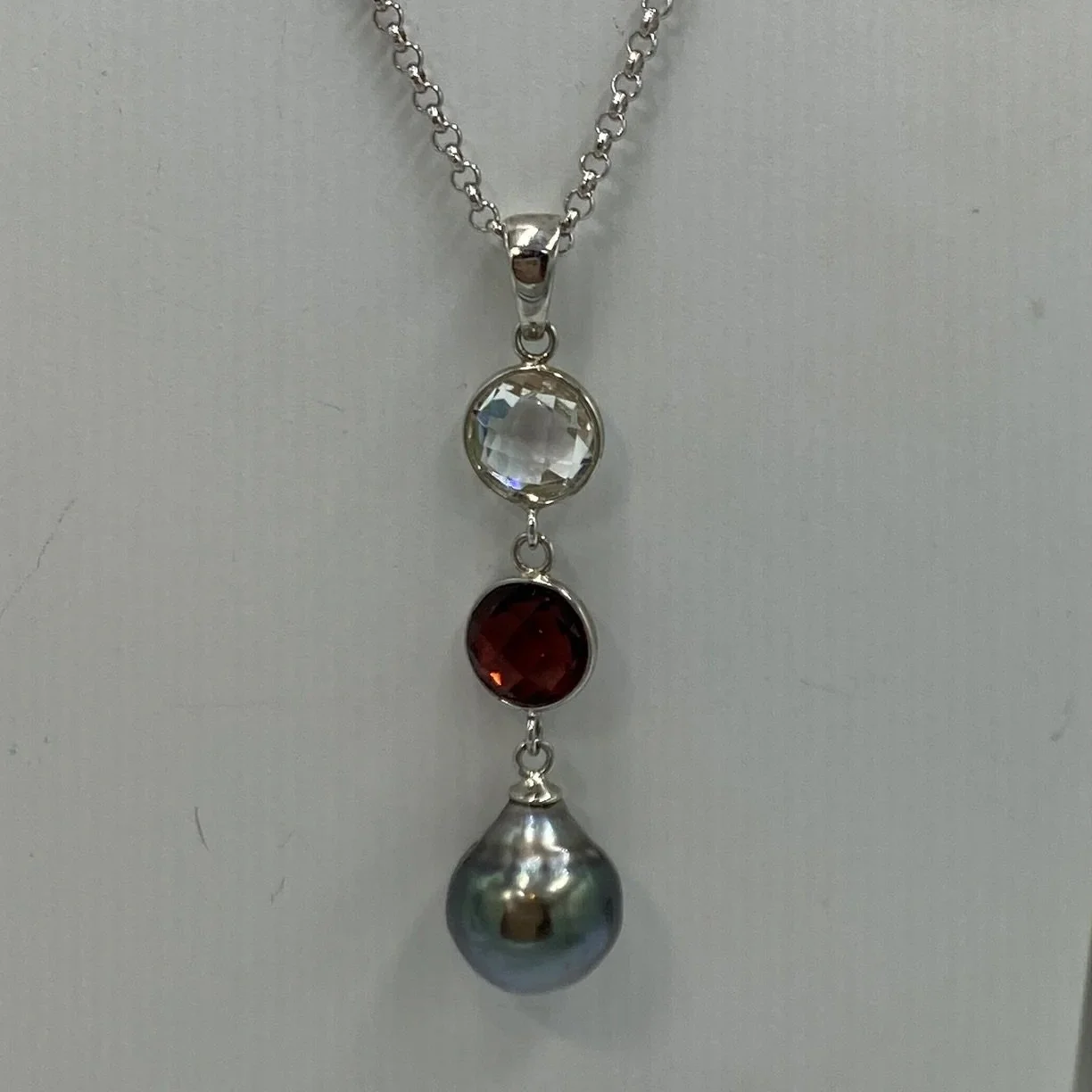 This pendant features an 8mm facetted garnet, clear quartz and a Tahitian South Sea Pearl. The pearl is Drop in shape and 10.1mm in size and a Pale Peacock Green with pink hues in color. It is crafted from 925 Sterling silver