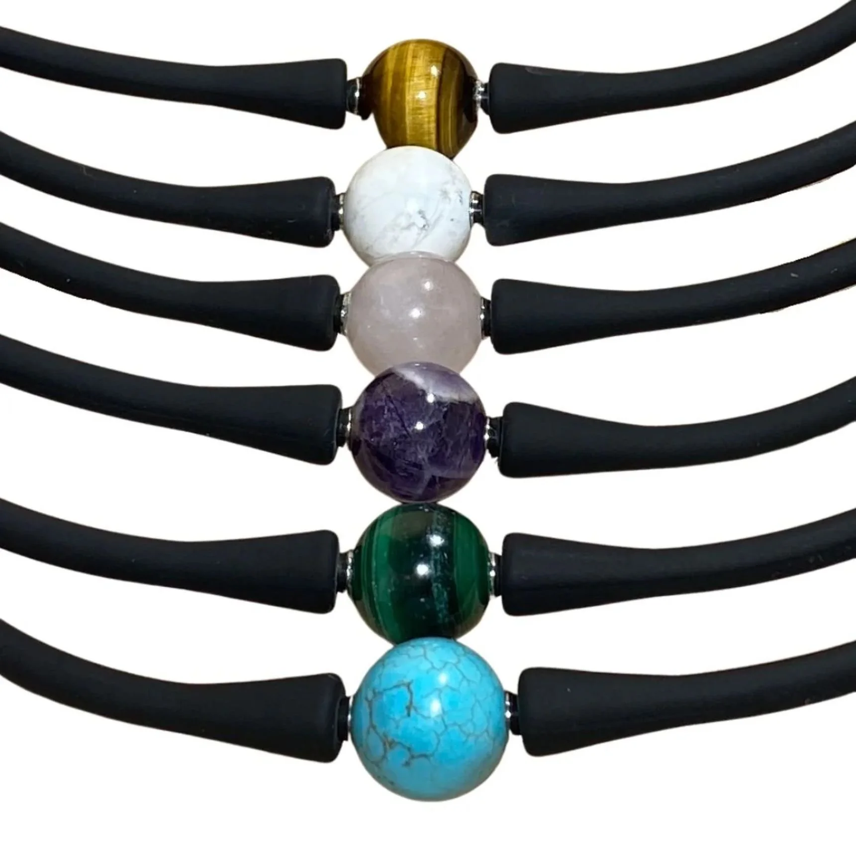 Black silicone necklace bands are interchangeable with the various semi precious gemstone beads below