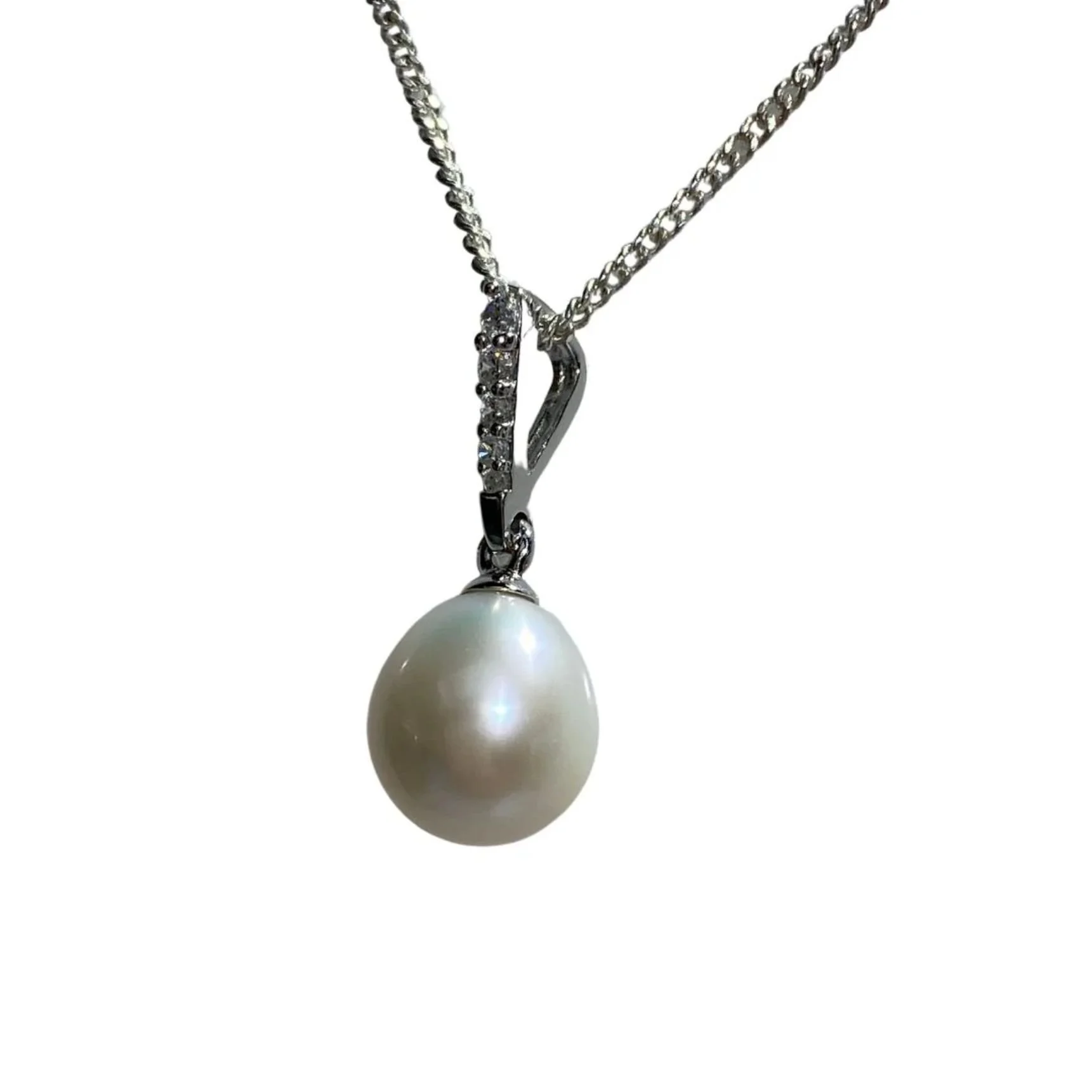 Image 1 of 1 'Lee' Freshwater pearl pendant $40.00 Custom Order: We hand-craft every piece to order, so please add your email address below and we'll be in touch as soon as possible (price may vary) Add To Cart Added! Sterling silver pendant featuring a 8.5mm White Drop Shape Freshwater Pearl and pave cubic zirconia. Sterling silver pendant featuring a 8.5mm White Drop Shape Freshwater Pearl and pave cubic zirconia. Reviews Reviewer Name Review Date Star Rating Description Posted on Etsy Product Show More