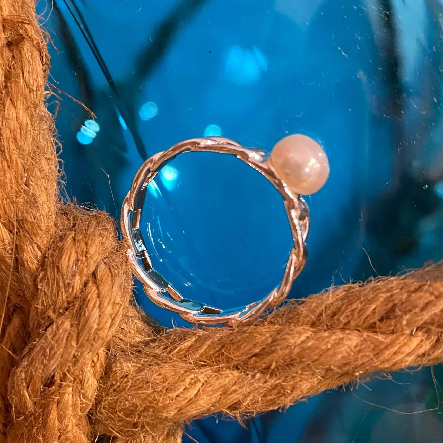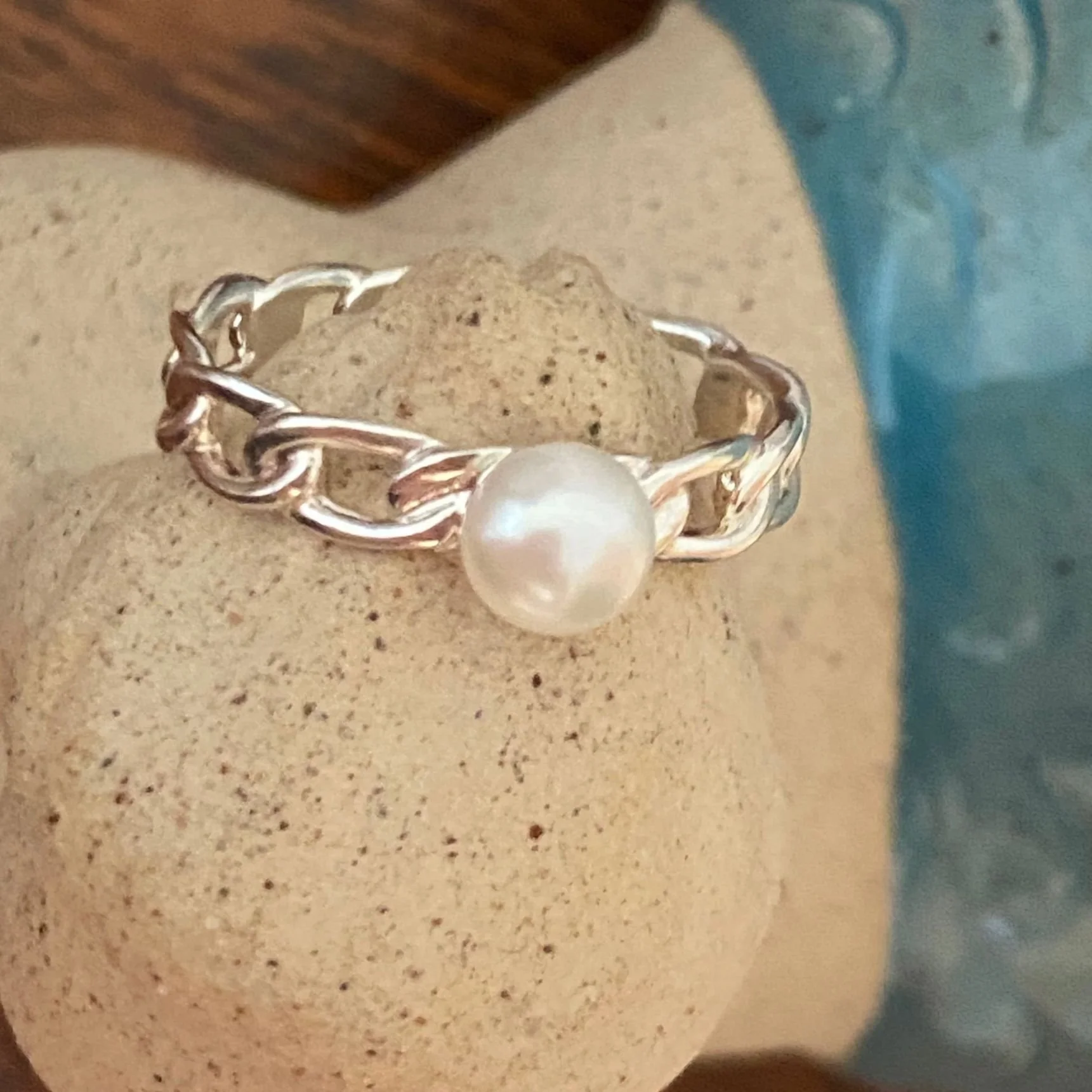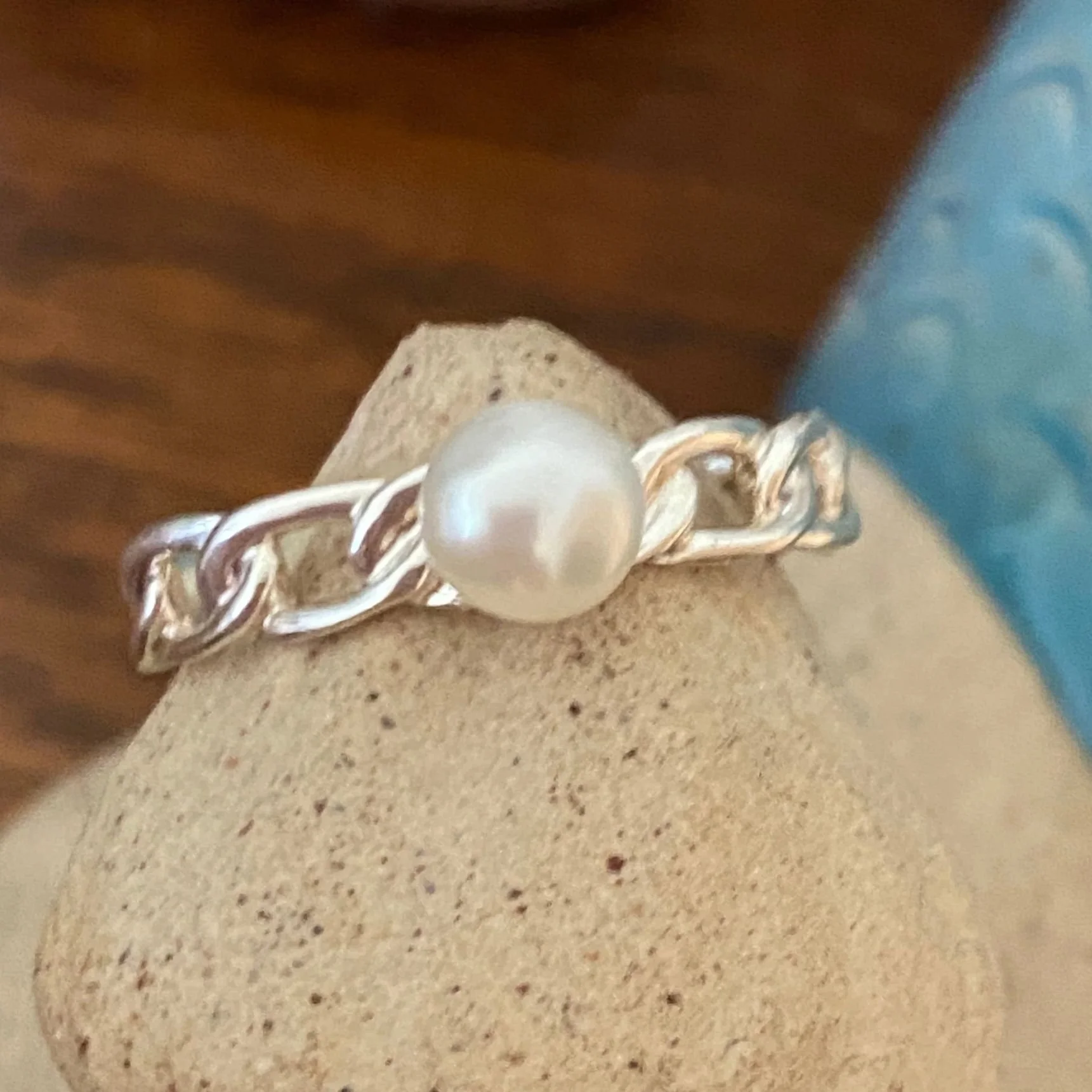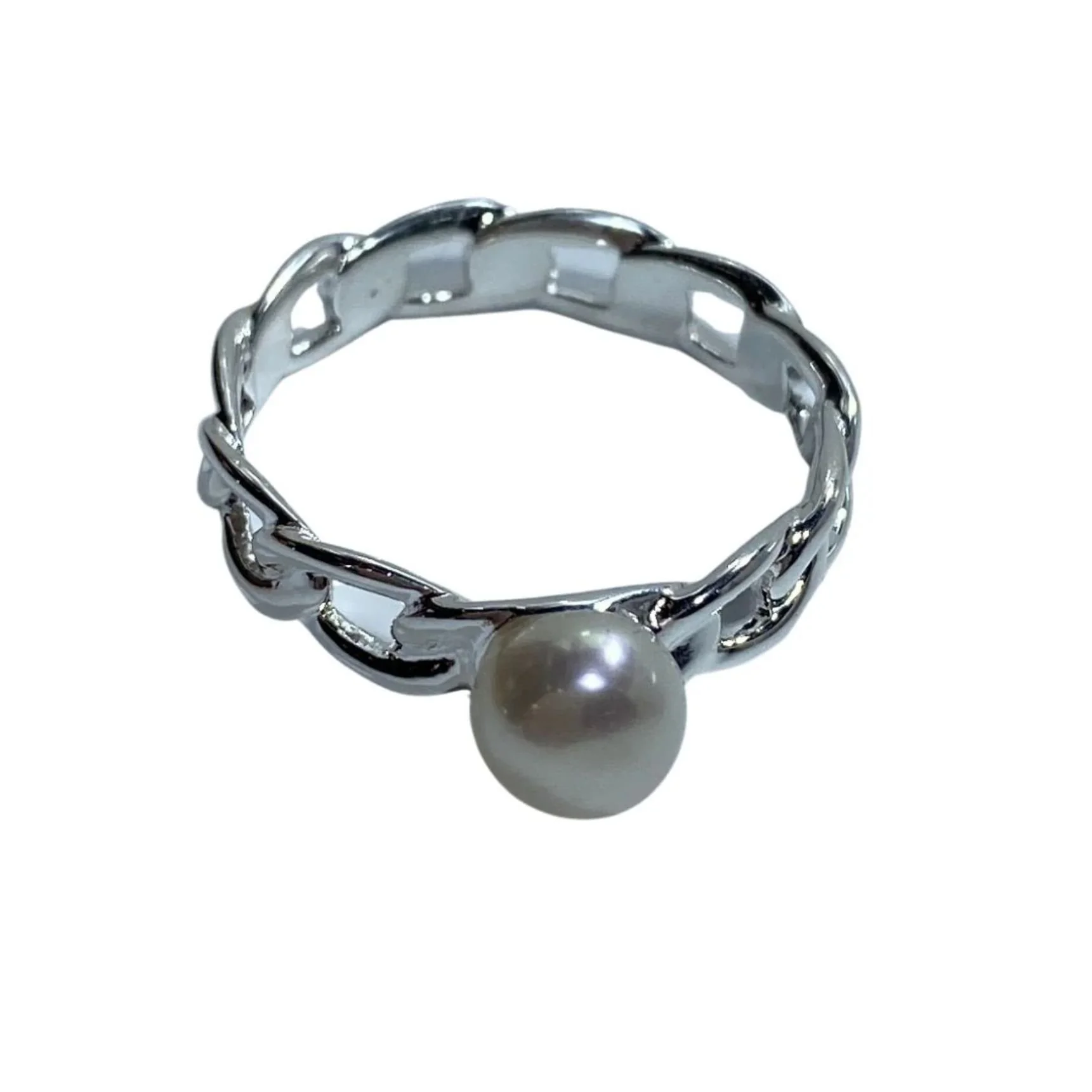 Sterling Silver Ring featuring a link style pattern band and a White 6-6.5mm Button shaped Freshwater Pearl.