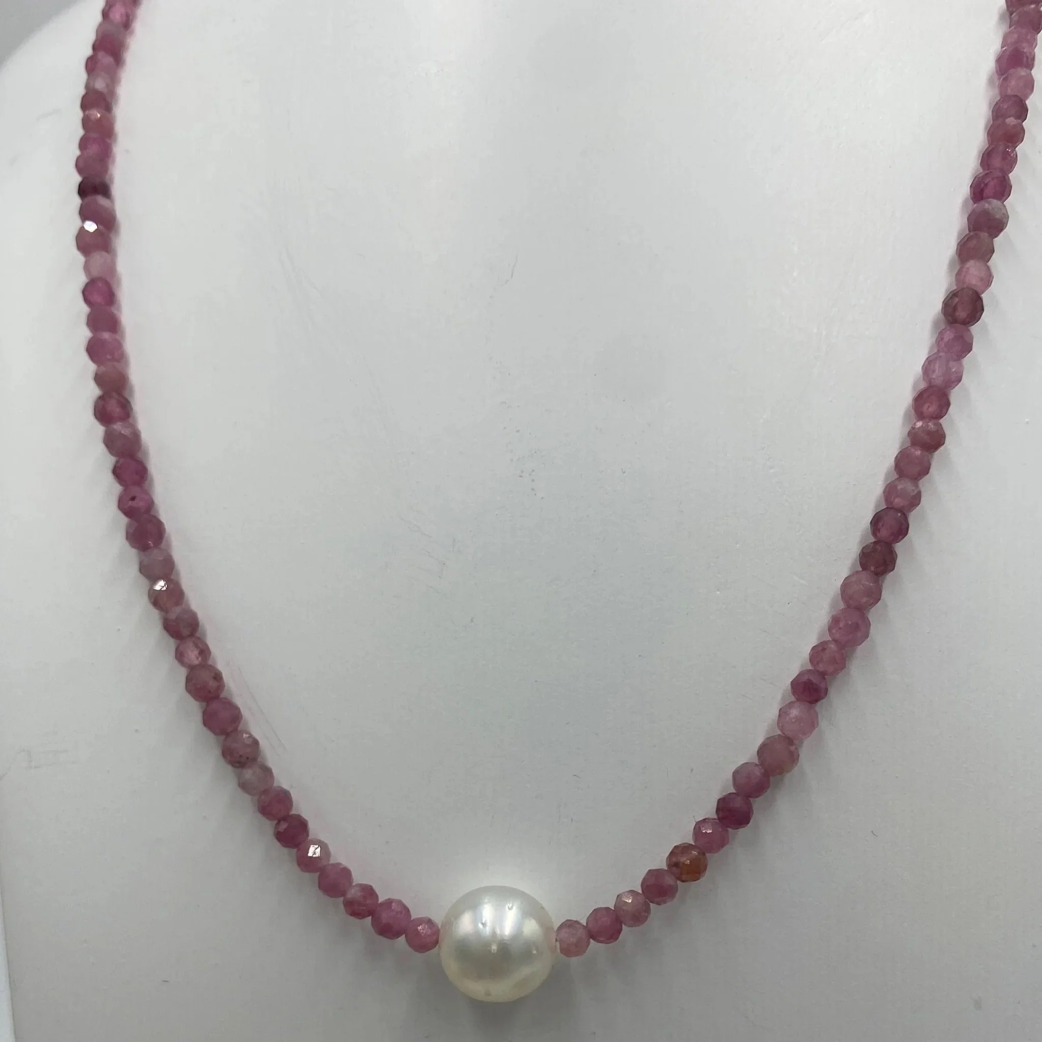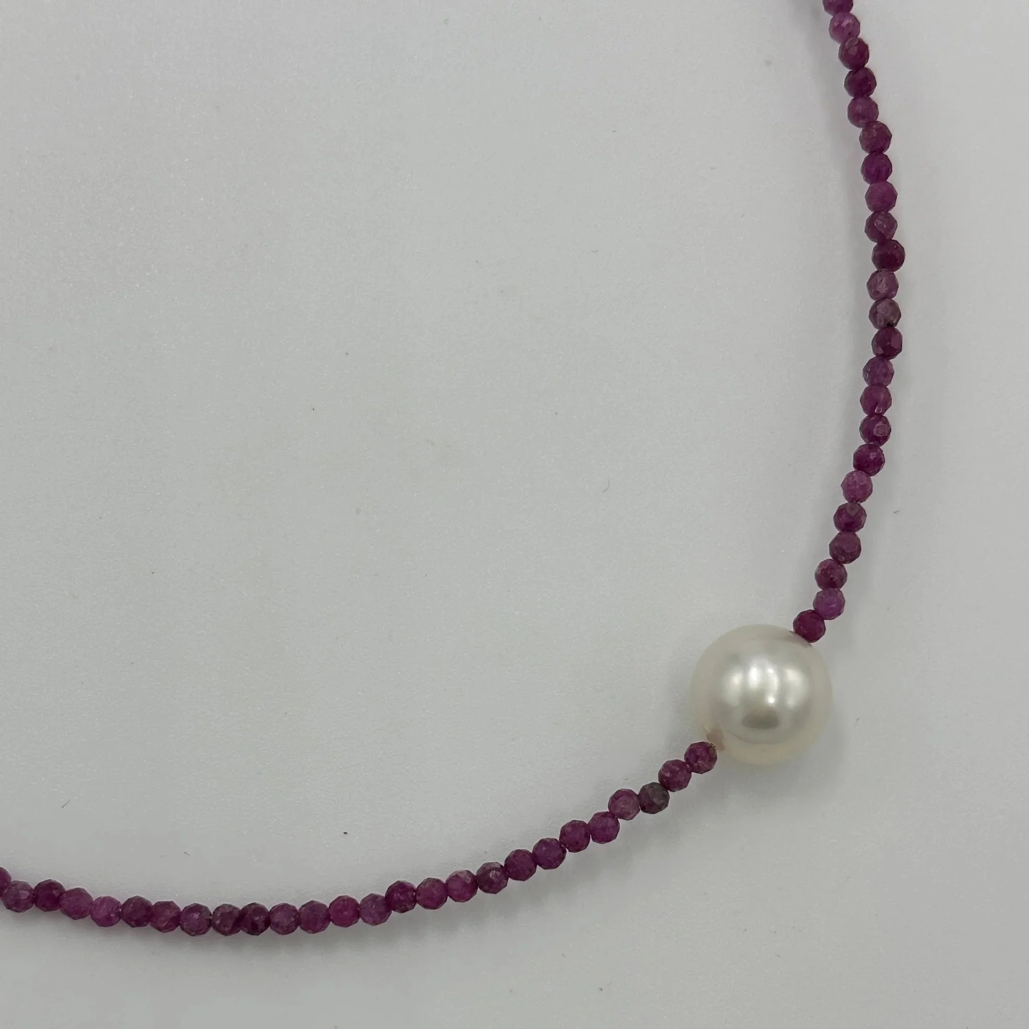 Australian South Sea pearl necklace with 2mm faceted deep red ruby gemstones and a 925 Sterling silver parrot clasp.
