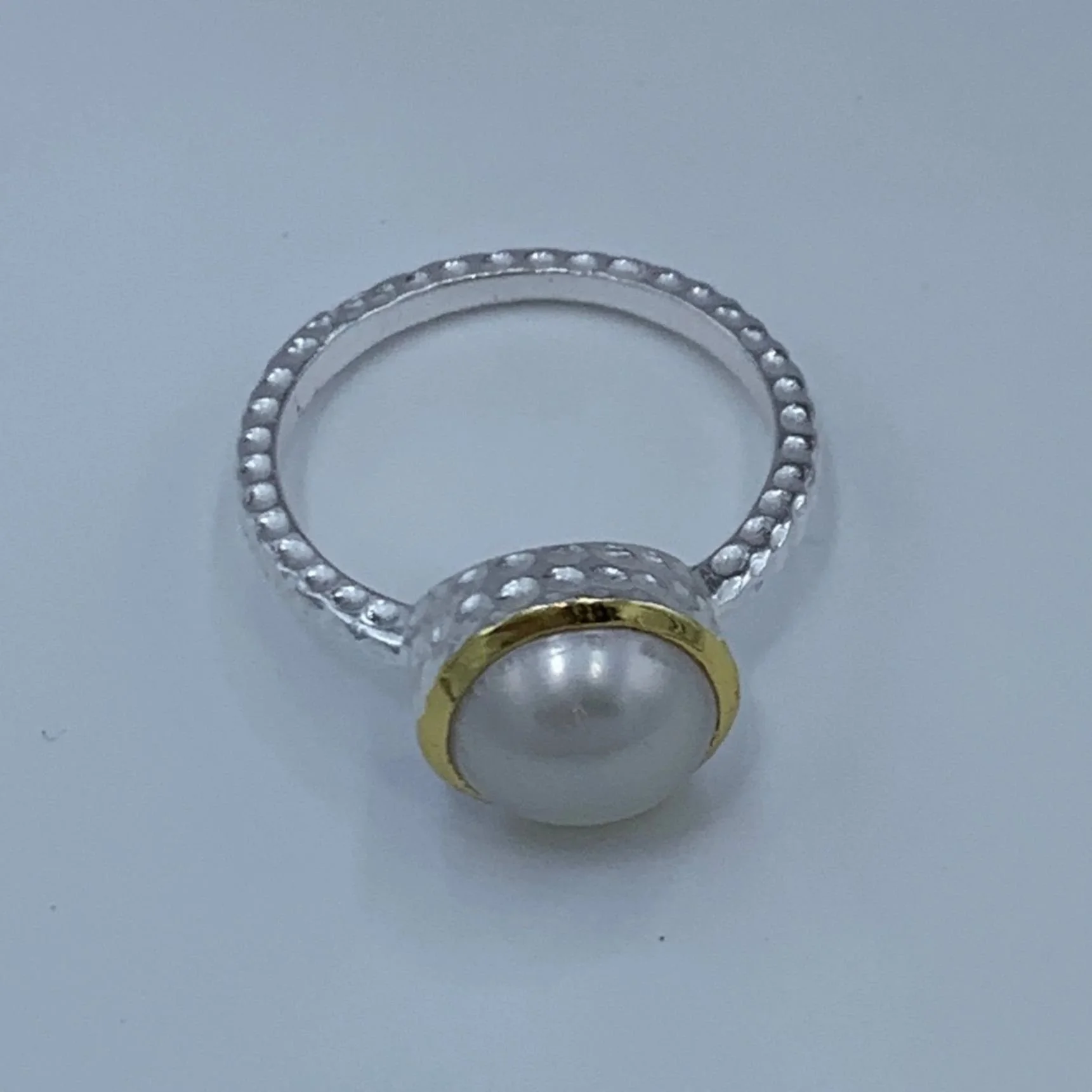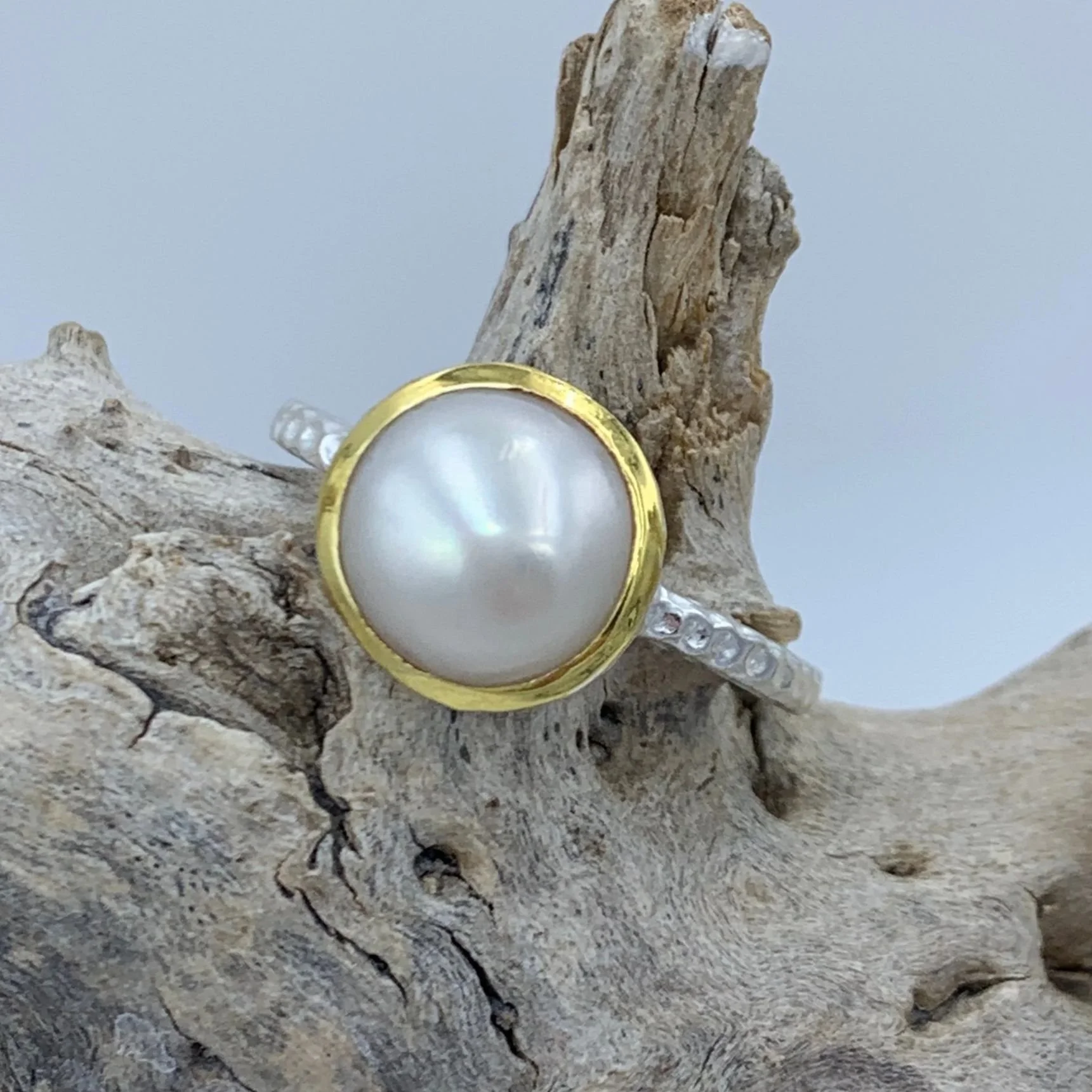 Two tone 14ct yellow gold plated satin finish sterling silver in a hammered texture with a central bezel set natural white pearl, 10mm Button shape freshwater pearl.