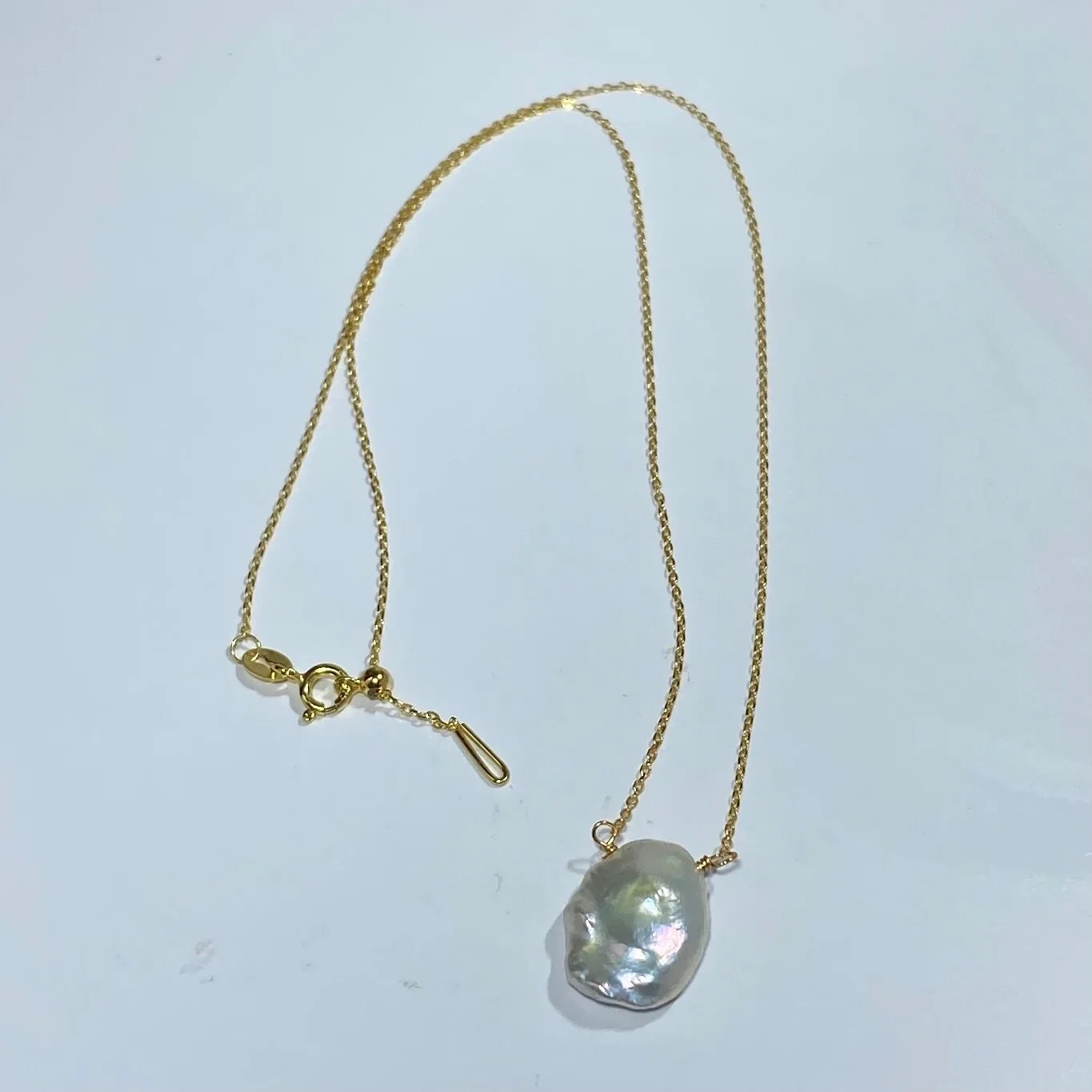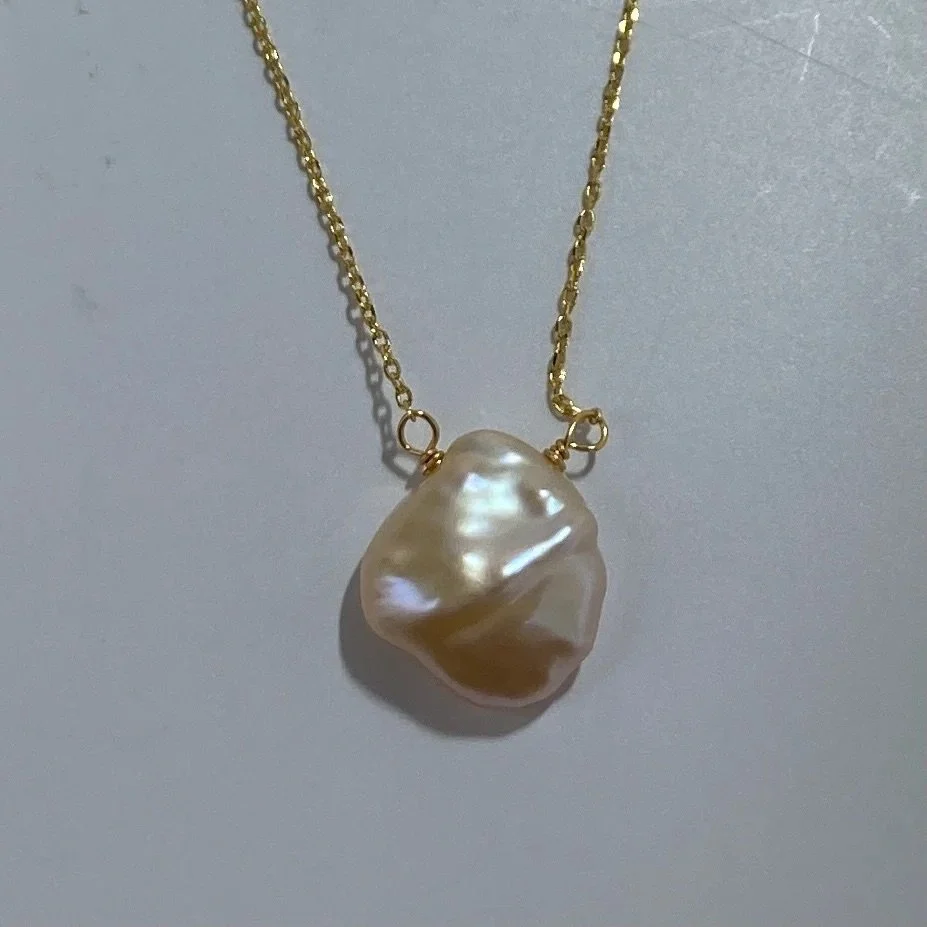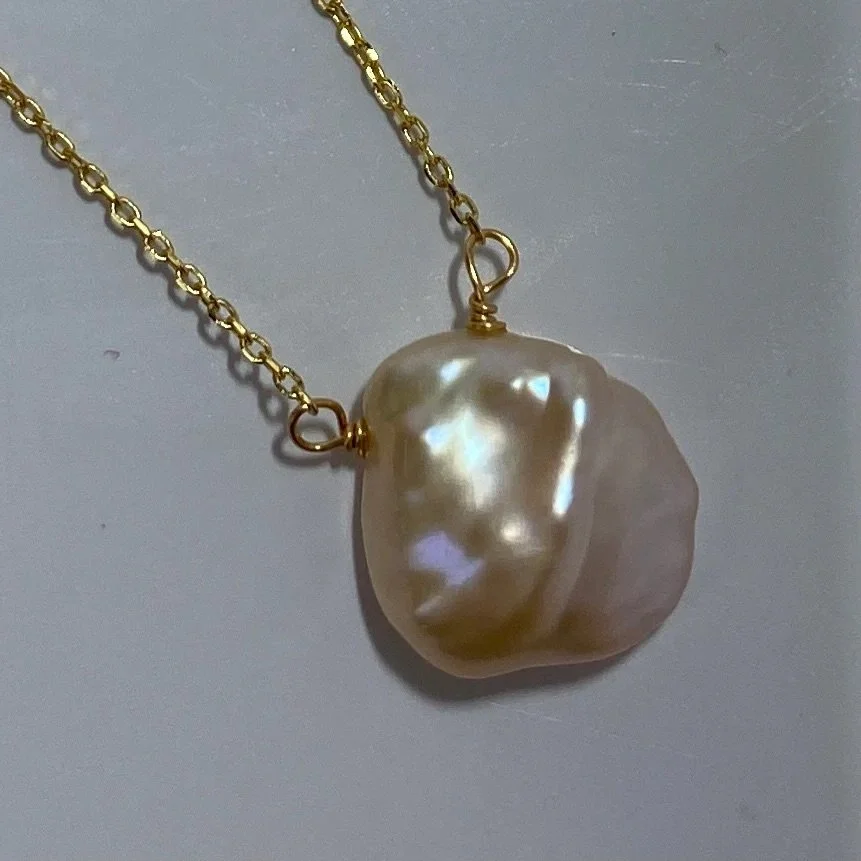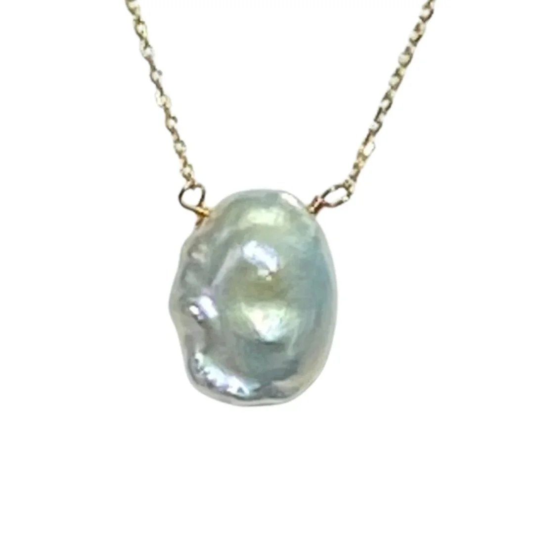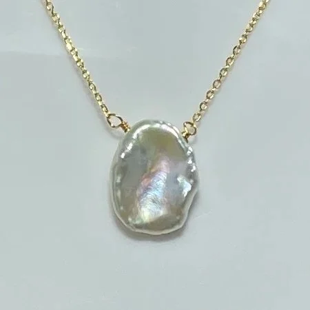 14ct gold plated Sterling silver chain and floating pendant featuring a seedless Keshi pearl, high lustre and White with pink hues in color, 13 x 17mm in size